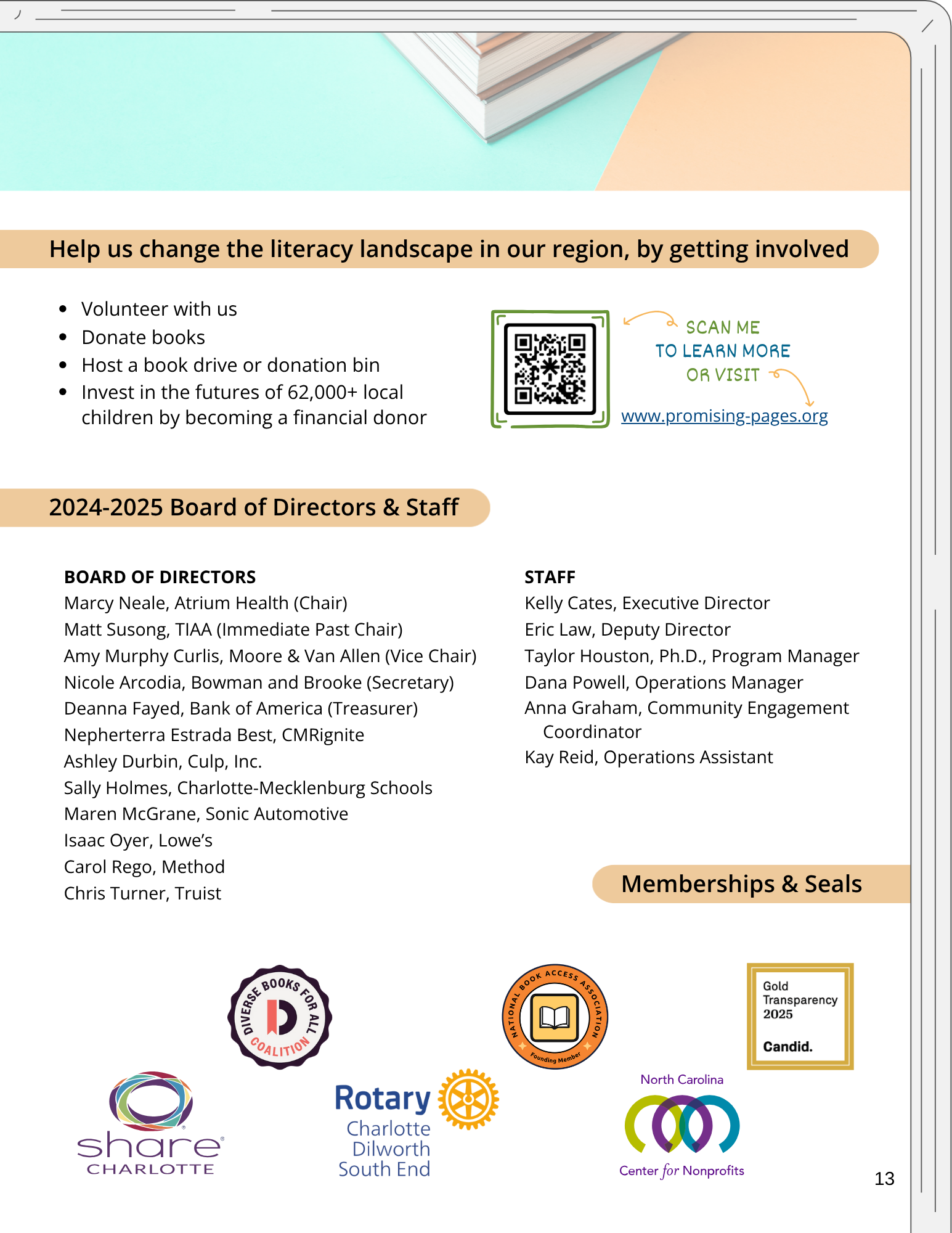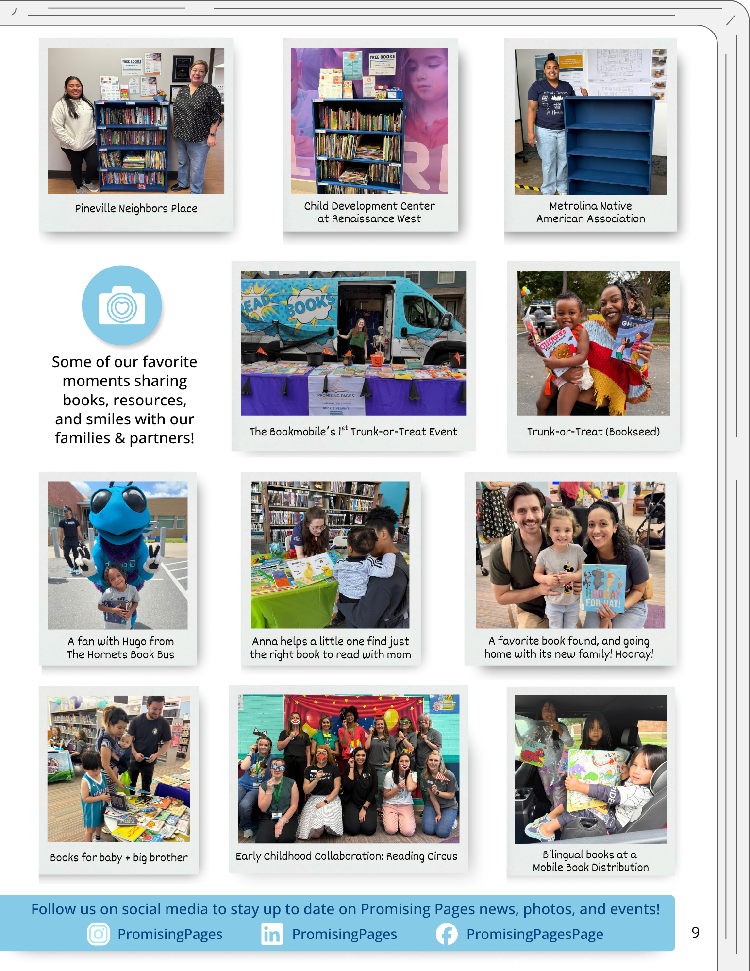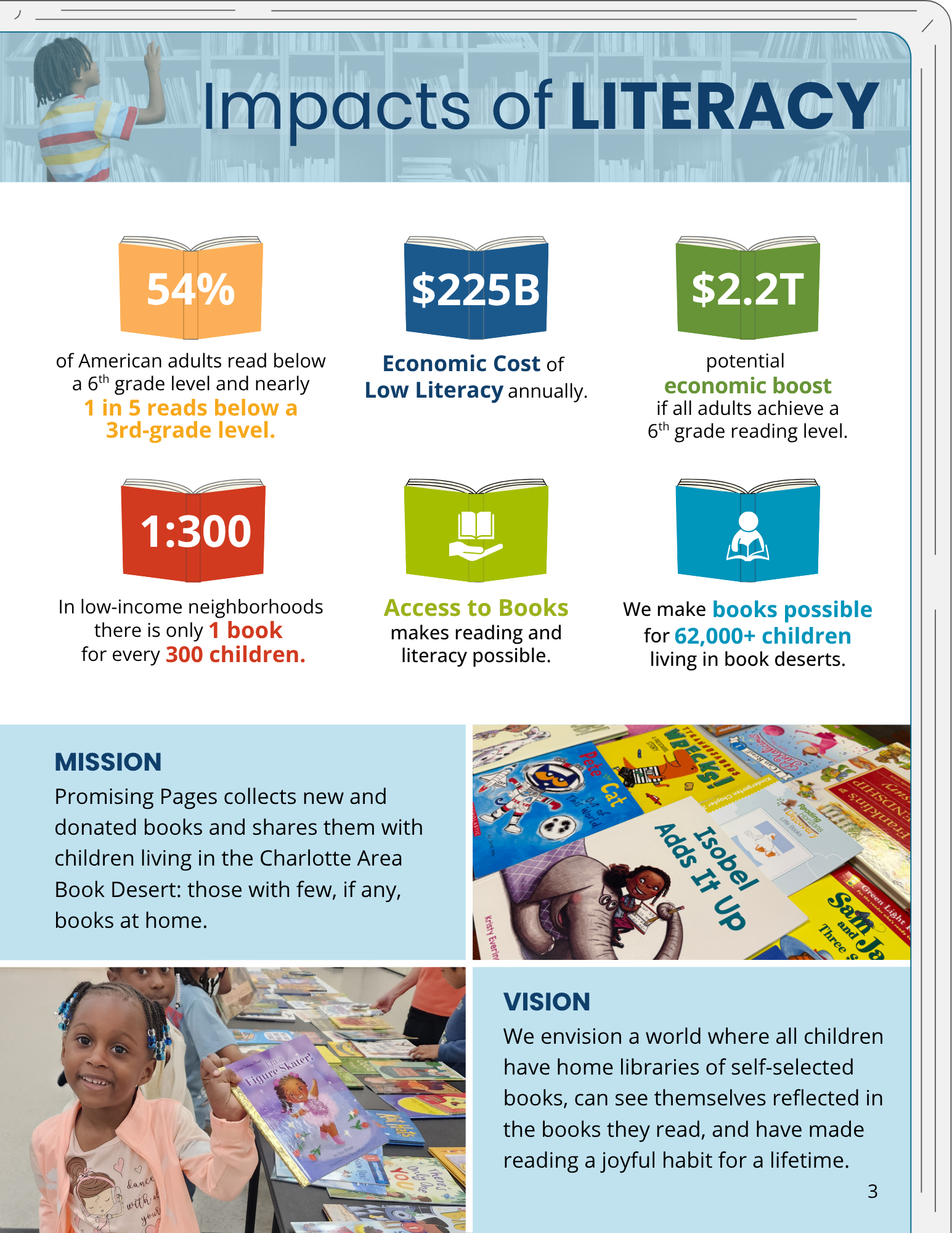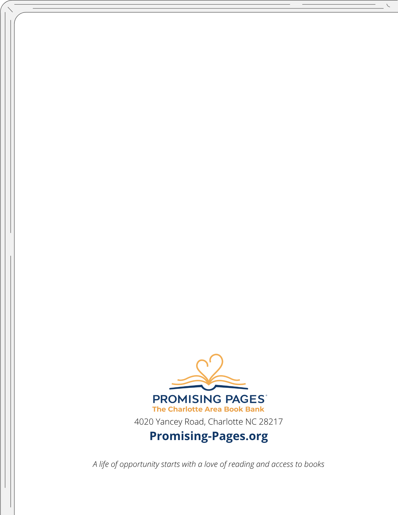 Promising Pages collects new and donated books and shares them with children living in the Charlotte Area Book Desert: those with few, if any, books at home. We work to create a culture of book sharing and ownership.