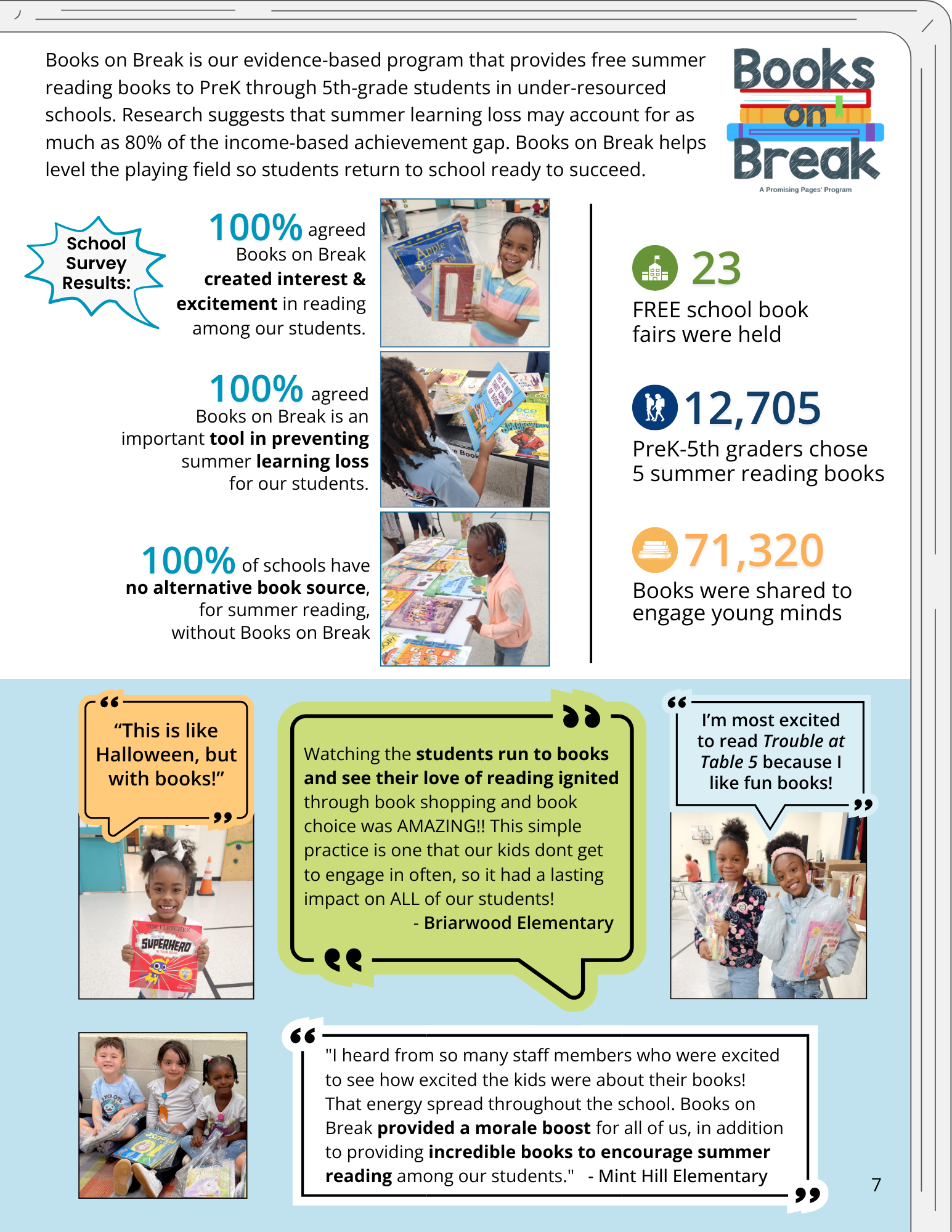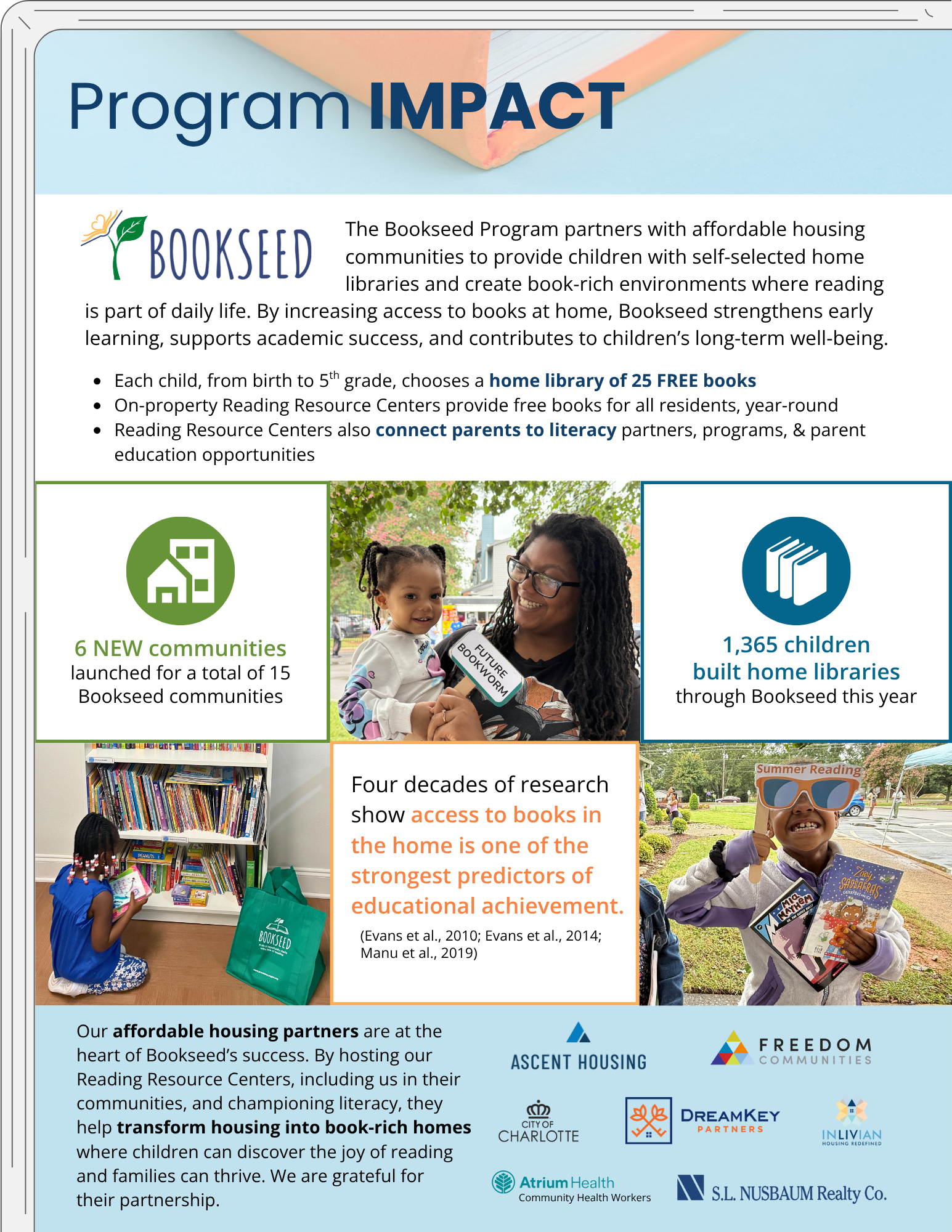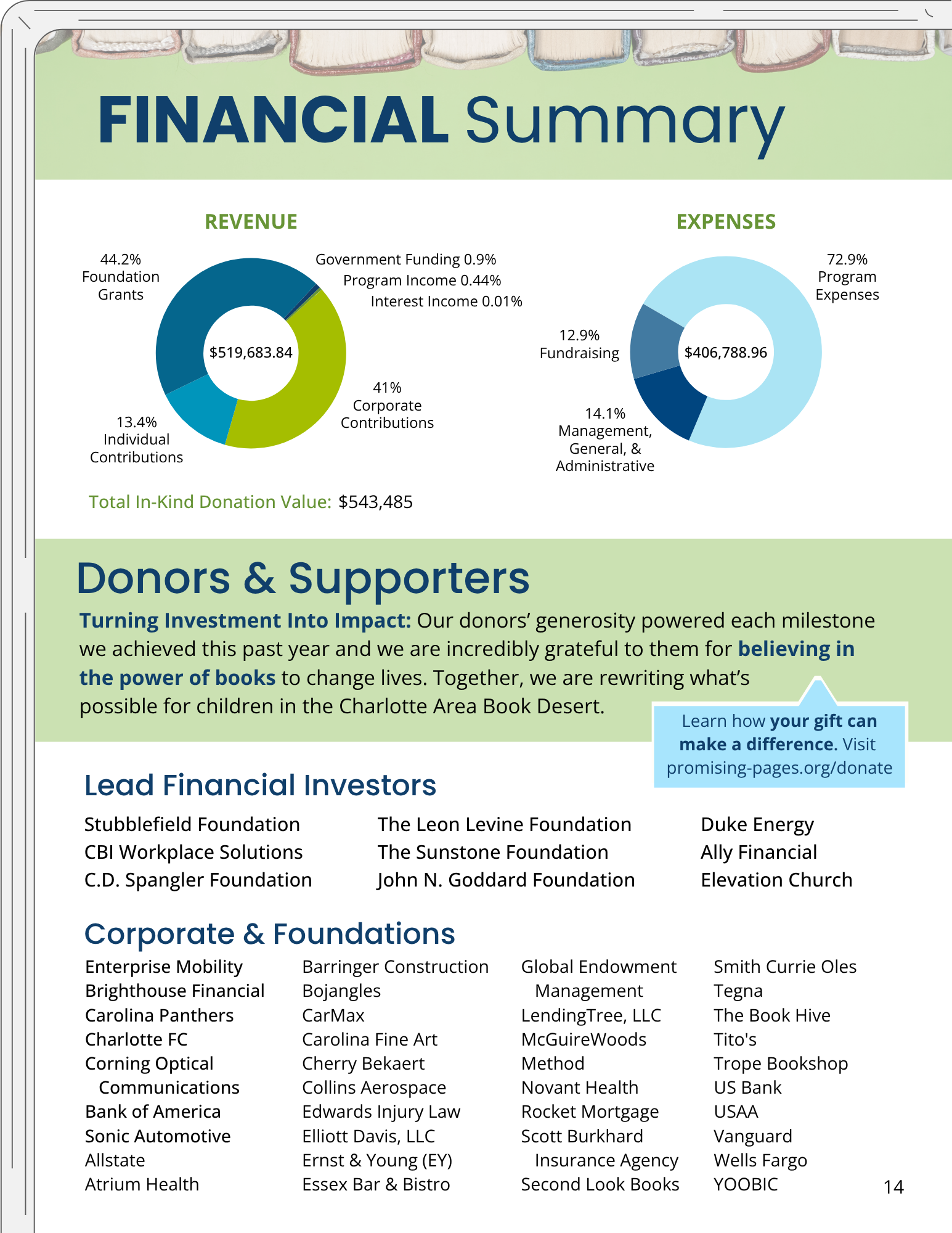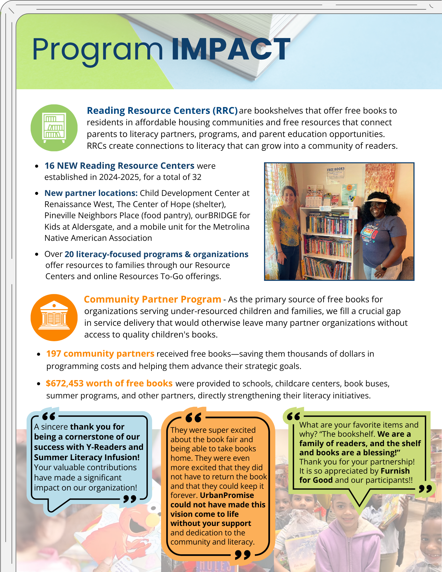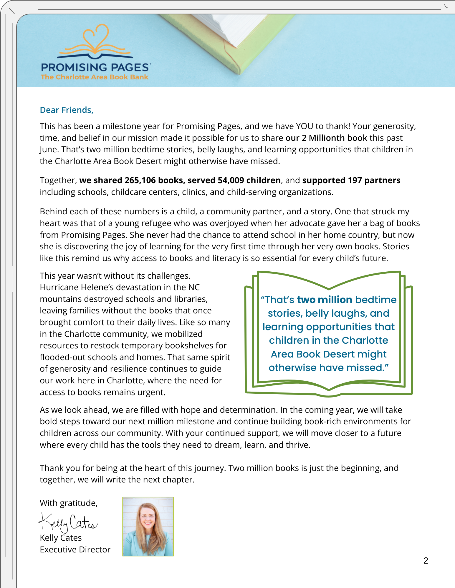 Promising Pages collects new and donated books and shares them with children living in the Charlotte Area Book Desert: those with few, if any, books at home. We work to create a culture of book sharing and ownership.