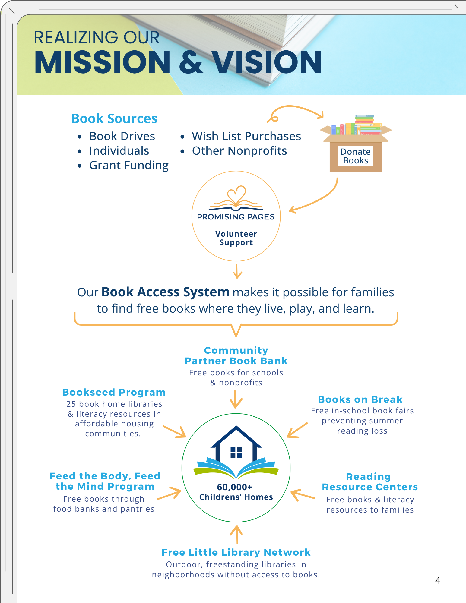 Promising Pages envisions a world where all children have home libraries of self-selected books, can see themselves reflected in the books they read, and have made reading a joyful habit for a lifetime.